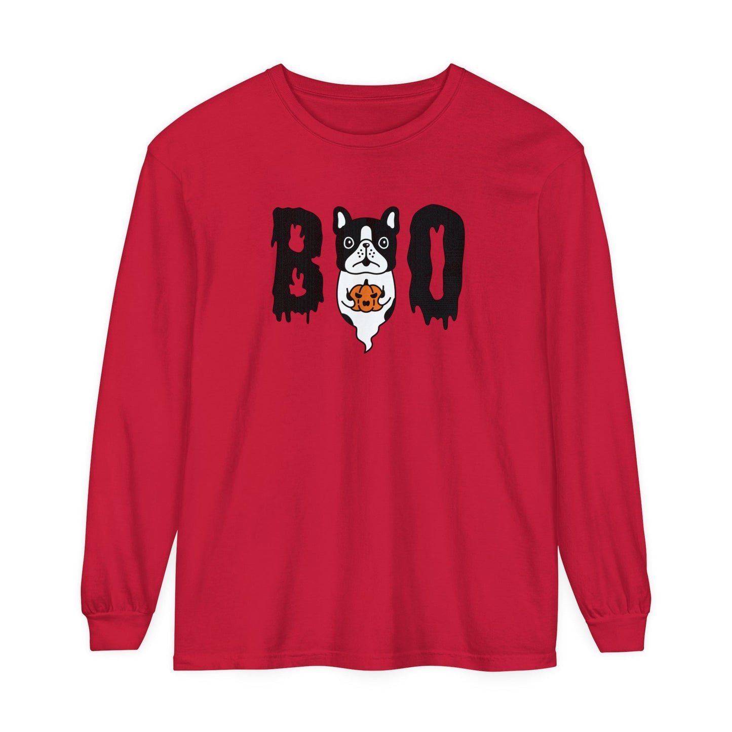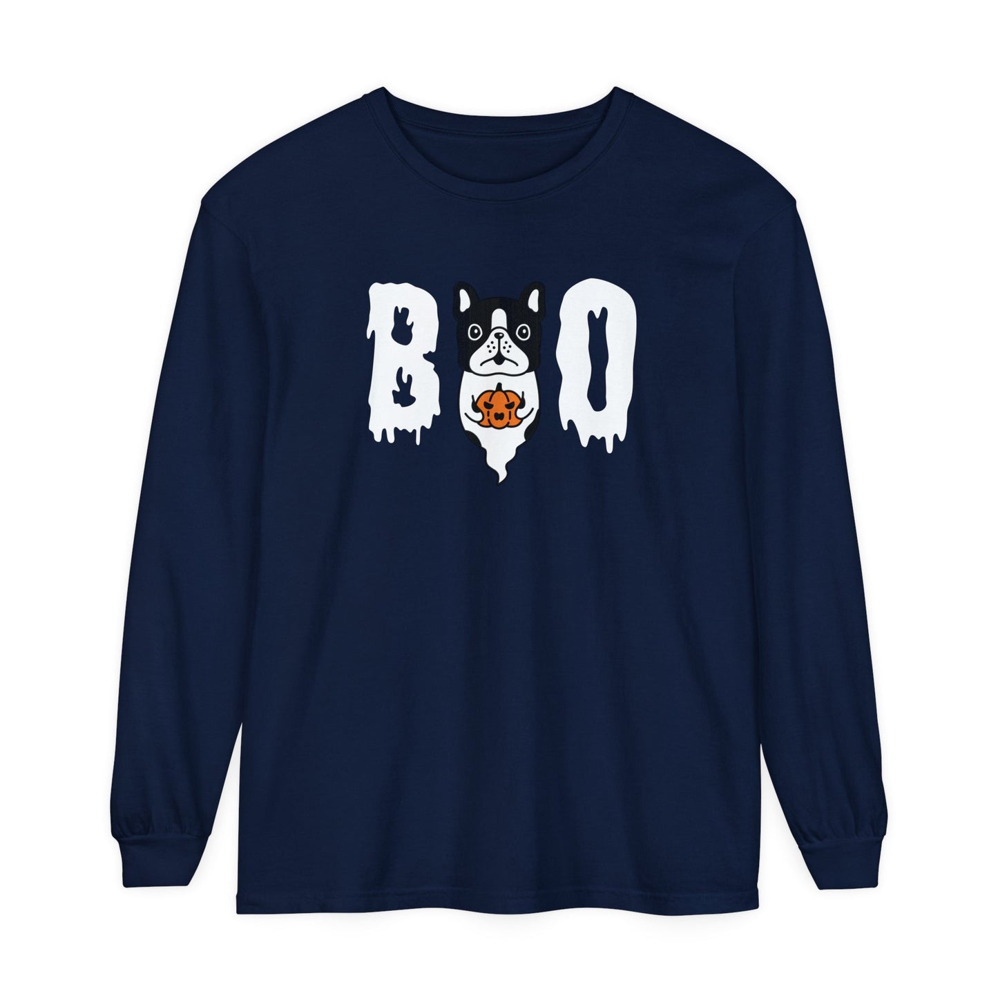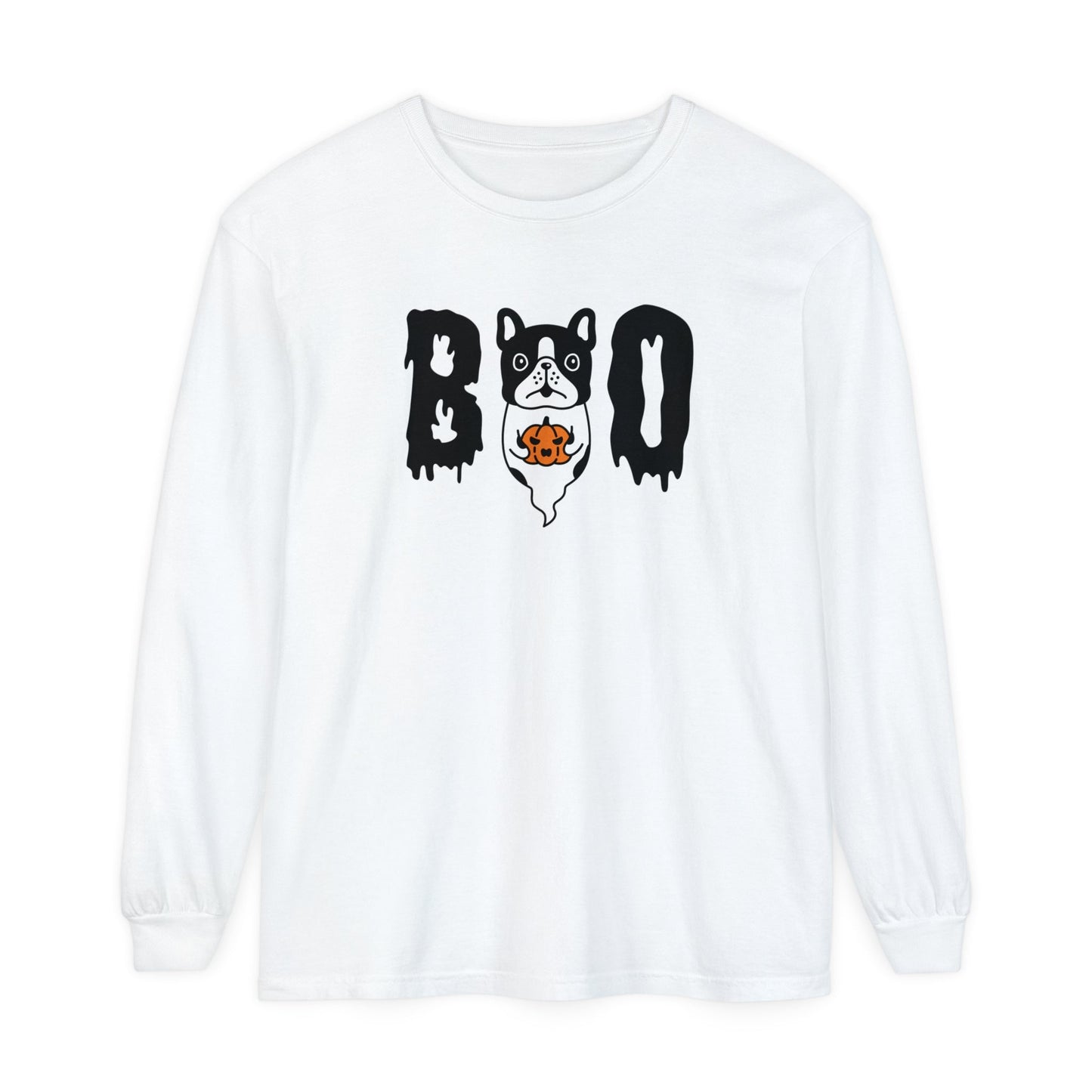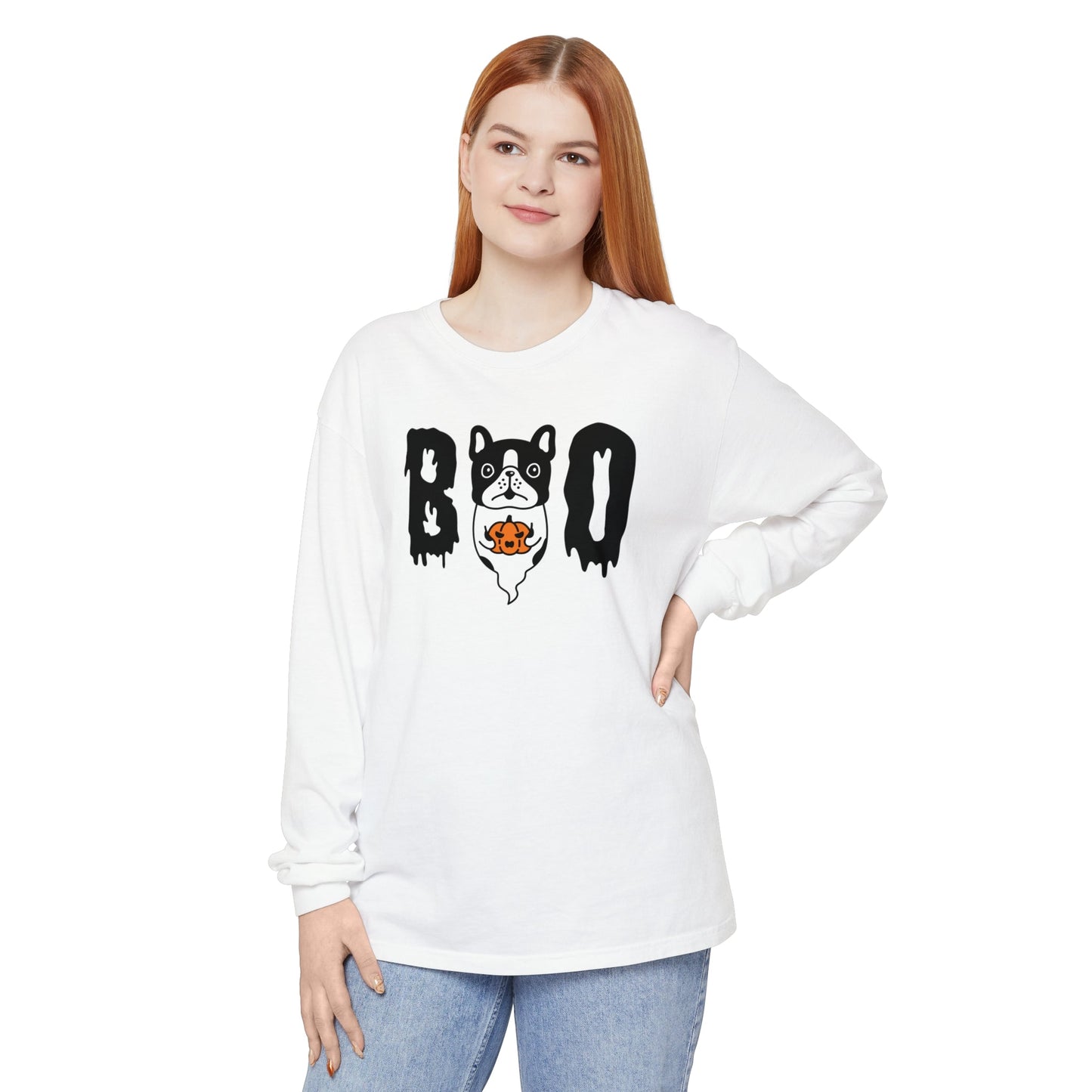 Get your into the Halloween spirit with our Boston Terrier “Boo” long sleeve tee! This comfy shirt adds just the right amount of spooky fun to your fall wardrobe. Whether they’re out with the kids collecting candy or just enjoying the season, this playful design is perfect for Boston lovers.