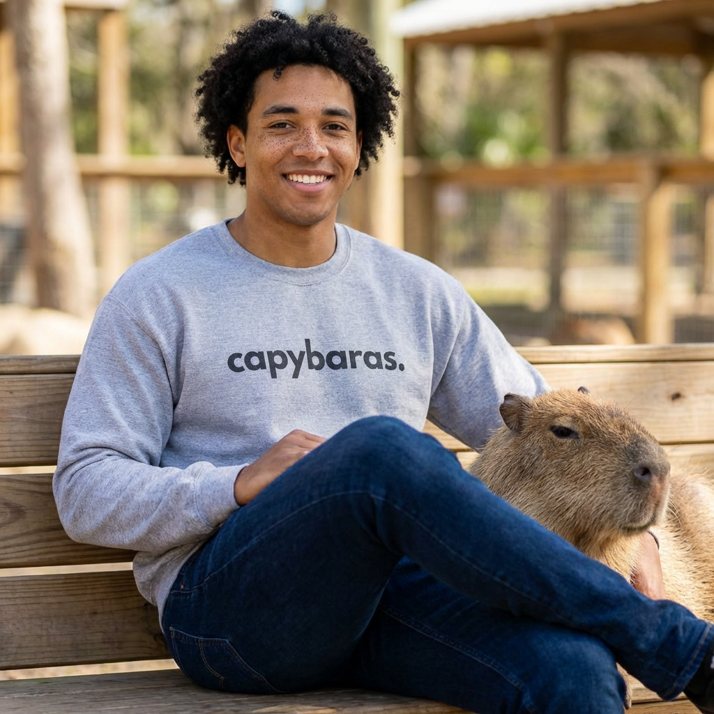 Capybaras get along with everyone — ducks, monkeys, crocodiles, birds perched on their backs. They move through the world with a calm, social ease that makes the rest of us look like we're trying too hard. This sweatshirt is for the people who are just genuinely good to be around.