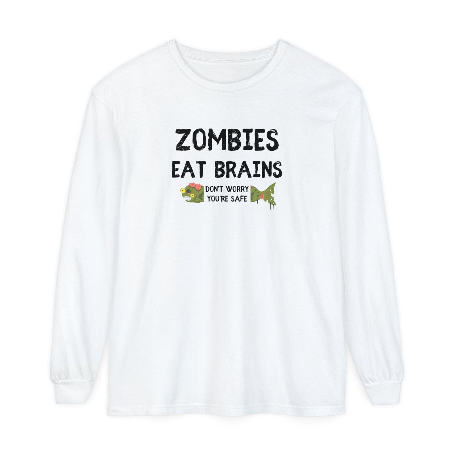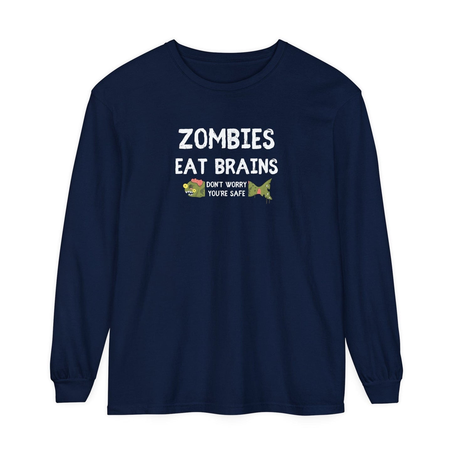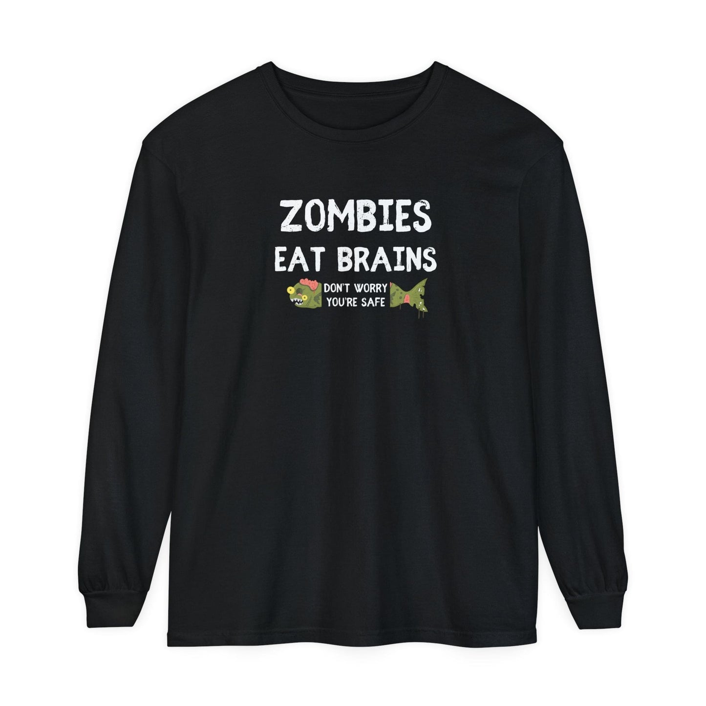 Ajoutez une touche d'humour à votre garde-robe d'Halloween avec le t-shirt à manches longues « Les zombies mangent les cerveaux. Ne vous inquiétez pas, vous êtes en sécurité » pour les amoureux des poissons ! Ce design ludique est parfait pour ceux qui aiment bien rire et qui veulent montrer leur amour pour les animaux aquatiques avec une touche effrayante.